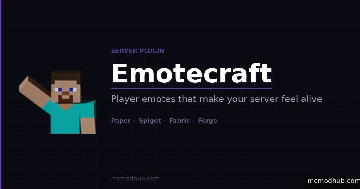 Emotecraft runs as a Bukkit plugin on Paper and Spigot servers. Players need the client-side mod installed to see and use animations both Fabric and Forge clients work with the same server plugin, which removes most of the compatibility headaches.